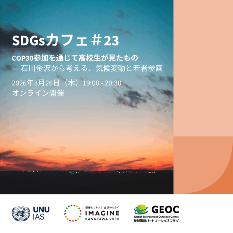 今回のSDGsカフェでは、地球環境パートナーシッププラザ(GEOC)の姜 そんうさんより、COPの仕組みやユース参画をめぐる国際的な動向について解説いただきます。あわせて、国連大学の次世代リーダー育成プログラムを通してCOP30に参加した金沢の高校生が登壇し、COPの現場で何を見て、何を感じたのかを共有します。