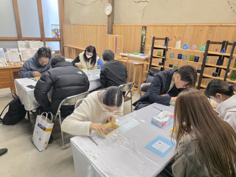 後半は、ガラス工房 STUDIO plusG にて見学とアクセサリー制作のワークショップを実施しました。