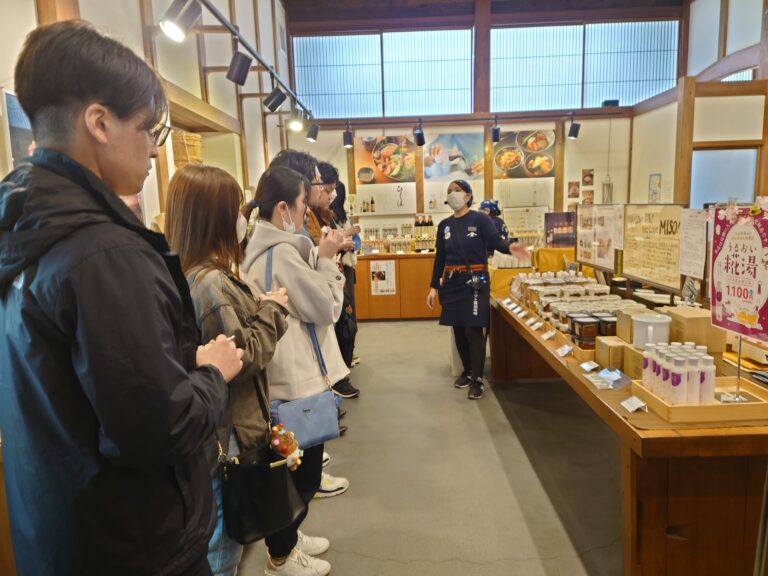 見学では、麹菌を用いた発酵食品の仕組みや、木桶を使った天然醸造の特徴について学びました。味噌づくりにおいては、麹菌・酵母・乳酸菌といった微生物が連携し、旨味や香りを生み出していることが紹介され、発酵の奥深さを実感する貴重な機会となりました。また、白山の伏流水や寒仕込みといった地域の自然環境を活かした製法にも触れ、地域とものづくりの密接な関係性を感じられる内容でした。試食では、味噌や醤油のもろみ、甘酒などが提供され、発酵食品の魅力を実際に体験しながら学ぶことができました。